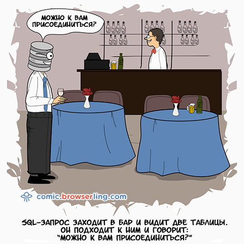 SQL-запрос заходит в бар и видит две таблицы. Он подходит к ним и говорит: "Можно к вам присоединиться?"