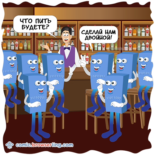 Восемь байтов заходит в бар. Бармен спрашивает: "Что пить будете?" Байты отвечают: "Сделай нам двойной!"